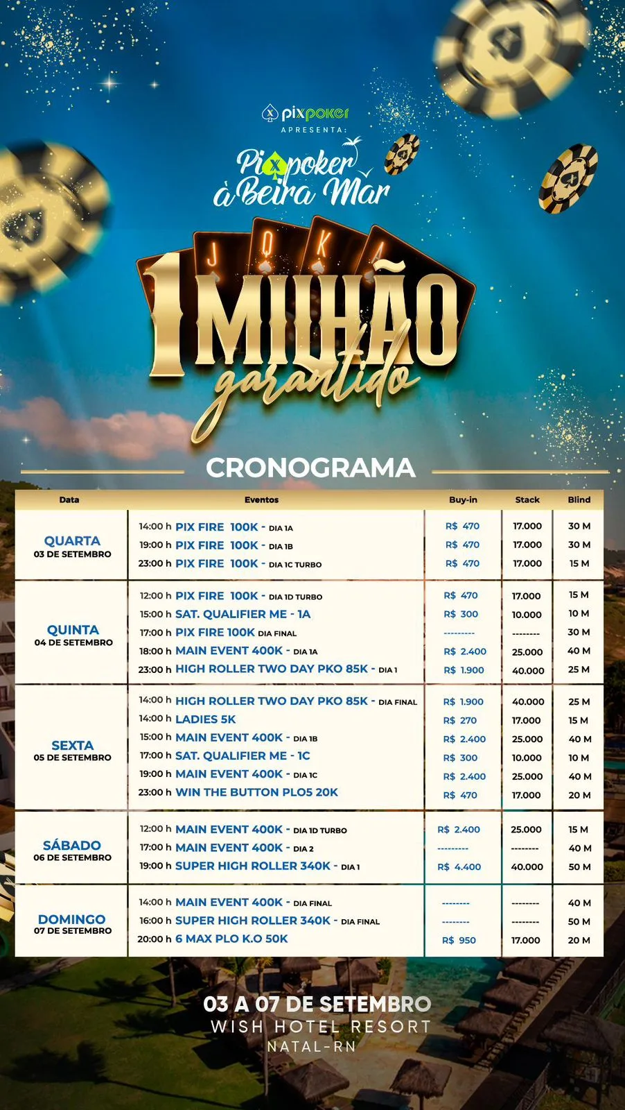 Está chegando a hora da grande festa do poker em Natal, Rio Grande do Norte. A capital potiguar vai receber a segunda edição do PixPoker à Beira Mar, que será realizada no Wish Resort a partir desta quarta-feira, com atrações tanto para jogadores quanto para a família.