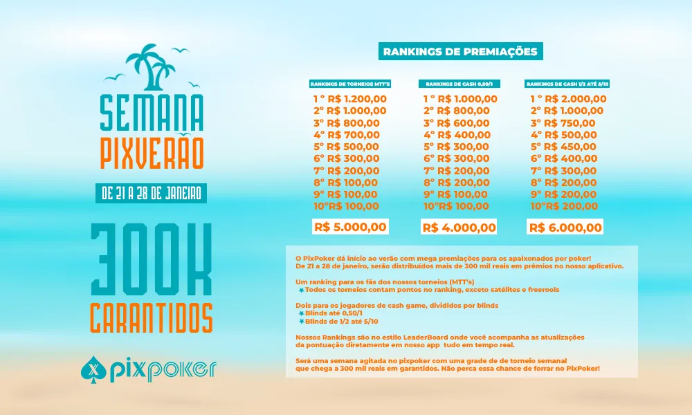 O PixPoker anunciou a realização de mais uma série em seu aplicativo e, aproveitando a época do ano, a plataforma organizou a Semana PixVerão. Com novidades tanto em torneios quanto para as mesas de cash game, a Semana PixVerão vai trazer R$ 300.000 em prêmios e contará com rankings para premiar os melhores jogadores.