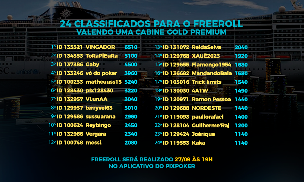 Com o primeiro lugar, Odemílson é um dos classificados para o Freeroll valendo o pacote para a Cabine Gold Premium no Navio PixPoker. O torneio valendo a vaga acontece no dia 27/09, às 19h, e os 24 melhores jogadores do ranking estão aptos a jogar. Abaixo, você pode conferir todos eles:
