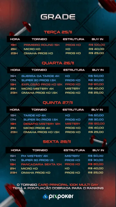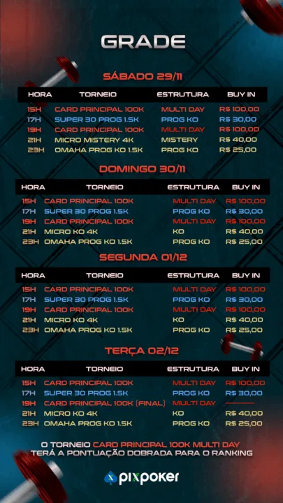 Para acessar o PixPoker é muito simples: basta baixar o aplicativo no celular, disponível para iOS e Android, instalar, fazer o cadastro e começar a jogar. Não dá para ficar de fora de uma série tão especial como essa! Confira abaixo a grade completa e todos os detalhes dessa disputa imperdível: