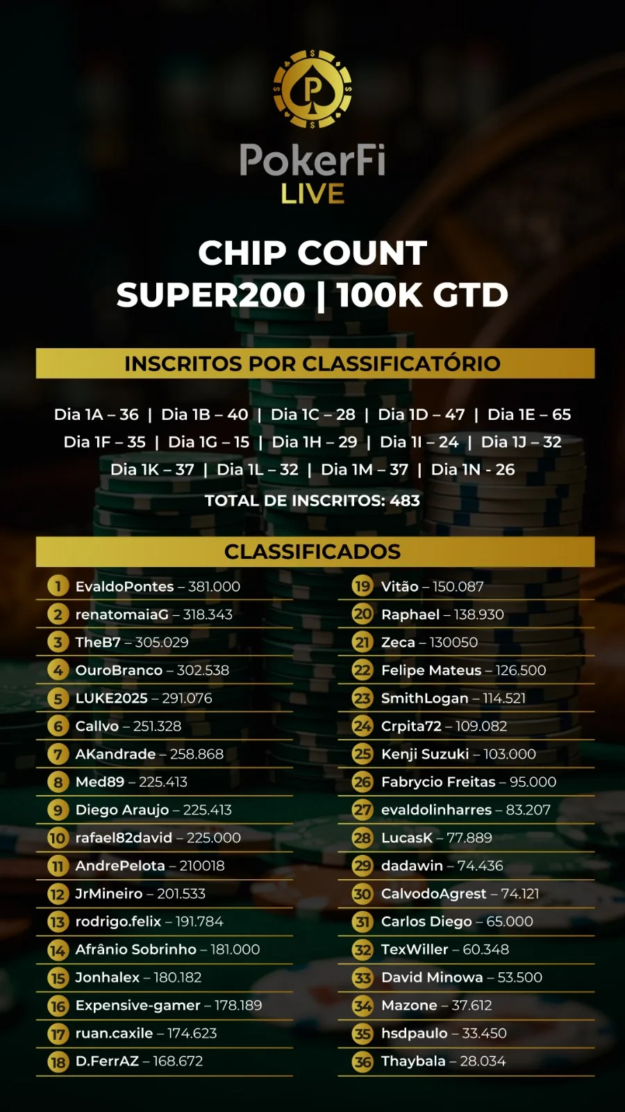 Querendo receber muito bem os amigos, Evaldo avançou com 381.000 fichas. Logo atrás aparece Renato Maia, outro sócio do evento, com 318.343 fichas. Completam o top 10 os jogadores das contas “TheB7” (305.029), “OuroBranco” (302.538), “LUKE2025” (291.076), “Callvo” (251.328), “AKandrade” (258.868), “Med89” (225.413), Diego Araújo (225.413) e Rafael David (225.000). O Dia Final é segunda-feira (12), com transmissão da MundoTV.