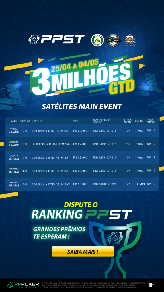 Além disso, o Main Event será fundamental para os jogadores acumularem pontos na disputa do Ranking PPST. Os cinco primeiros colocados terão como prêmio pacotes de viagem do PPPoker, que somam mais de R$ 60.000. Vale ressaltar que a série está disponível aos membros dos clubes da Liga Brasil 388, Liga Principal e Liga Extrema.