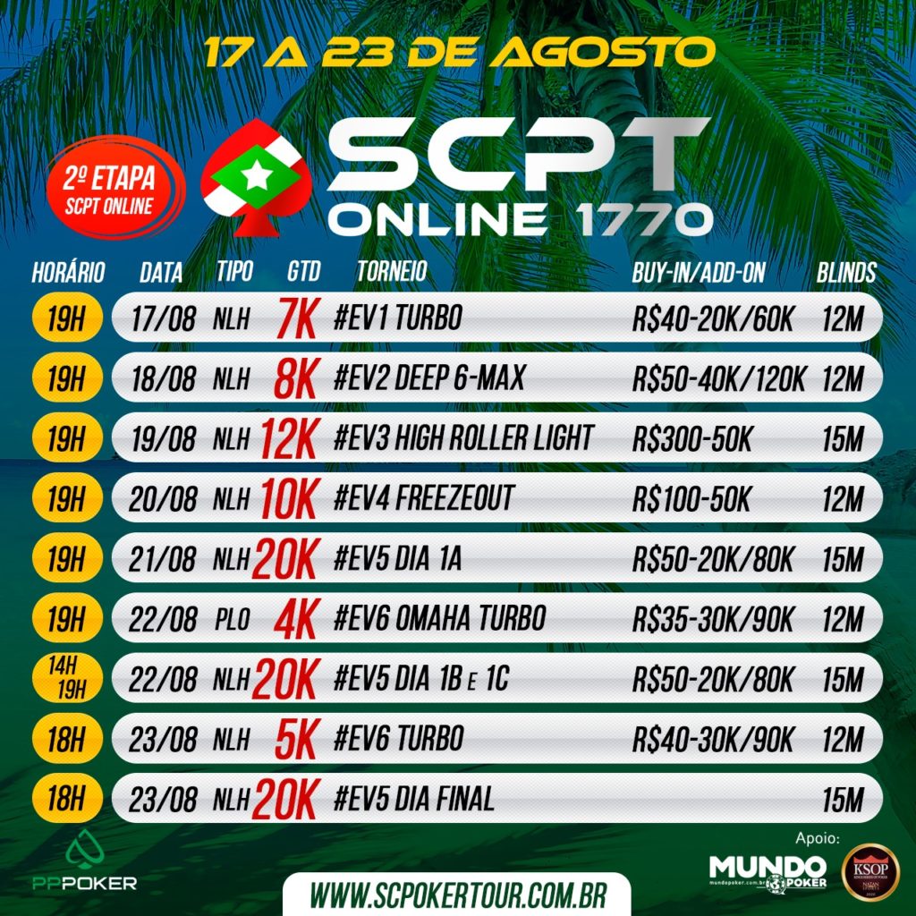 Também entra na lista dos mais esperados pela comunidade do poker o Evento #4: R$ 100 Freezeout. O garantido da competição é de R$ 10.000. Lembrando que a 2ª etapa da série acontece na liga SCPT Online 1770. Para saber o cronograma completo confira a imagem abaixo:
